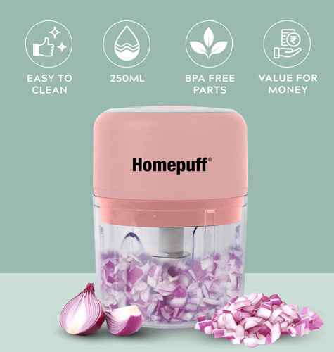 Built with Precision: This chopper comes with an unbreakable waterproof plastic body, anti-slip base and 3 Durable razor-sharp Sharp blades with One-Touch Press-to-Chop operation for chopping all your ingredients in seconds- vegetables, salad, fruits and more.Crafted for Versatility: Charge your chopper on the go with a USB charger! Lightweight, portable and compact design, perfect for domestic use or while traveling. This chopper is perfect for cutting onions, garlic, tomatoes, vegetables, salads, herbs, fruits, boneless meat, nuts and more in seconds. It can also be used to whip up chutneys, tomato puree, eggs, batter and other assortments quickly and safely.Designed with Passion: Comes with a waterproof body with 250 ml capacity, this handy and compact chopper also serves as a container to store and keep food fresh. Blades, bowl and storage lid are top-rack dishwasher safe and components can be separated for easy cleaning. Comes with a high-performance 30W motor with a rated voltage of 5V & a long lasting 1200mAh lithium-ion battery.Healthy for You: Made with 100% BPA-free materials and developed to preserve all the natural flavours and prevent taste contamination. Blades, bowl and storage lid are top-rack dishwasher safe and components can be separated for easy cleaning.Powerful and Reliable: It comes with a magnetic safety lock feature that automatically shuts off the blades when the mixing bowl lid is opened. Also comes with a Home Puff warranty of 6 months, which keeps you covered after the purchase, T&C applied