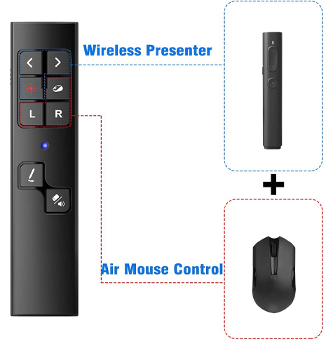 2 IN 1 PRESENTATION CLICKER : This presentation remote combine normal PPT wireless presenter with Air mouse control (Left Mouse), Upgraded powerpoint clicker with stabler performance, built-in six-axis gyroscope, no delay, no drift. Air mouse feature allows interaction without being at computer to help you don’t be tied down to your computer.