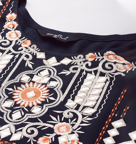 Navy blue woven palazzosFloral embroideredOpaqueWide leg fitElasticated waistbandLength: regularWoven viscose rayon fabricSize & FitWide Leg fitThe model (height 5'8) is wearing a size SMaterial & CareViscose RayonMachine wash
